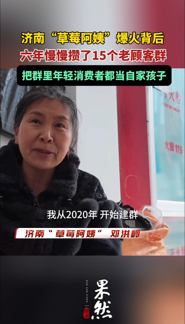 果然视频|济南“草莓阿姨”爆火背后:六年攒了15个老顾客群齐鲁晚报·齐鲁壹点客户端 09:44原创近日,济南市奥体龙湖天街附近的一处水果流动摊点,因一条网友发布的“太好吃”评价视频,意外在社交平台“火出了圈”。摊主邓洪岭售卖的盆装草莓吸引众多市民专程前来排队购买,她也因此被网友亲切地称为“草莓阿姨”。在她看来,老顾客都是一个个攒下来的,把群里年轻消费者都当做自己的孩子来看。(齐鲁晚报 ·齐鲁壹点记者 管悦 江聆譞)