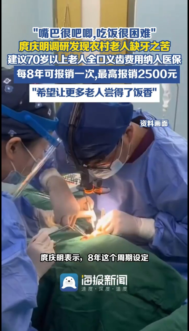 他在雅安调研时发现,很多老年人“嘴巴很吧唧,吃饭很困难”,一副全口义齿几千上万块,不少农村老人根本镶不起。他建议:将70岁以上老人全口义齿修复纳入医保,每8年可报销一次,最高2500元,最终希望就是让更多老人尝得了饭香。