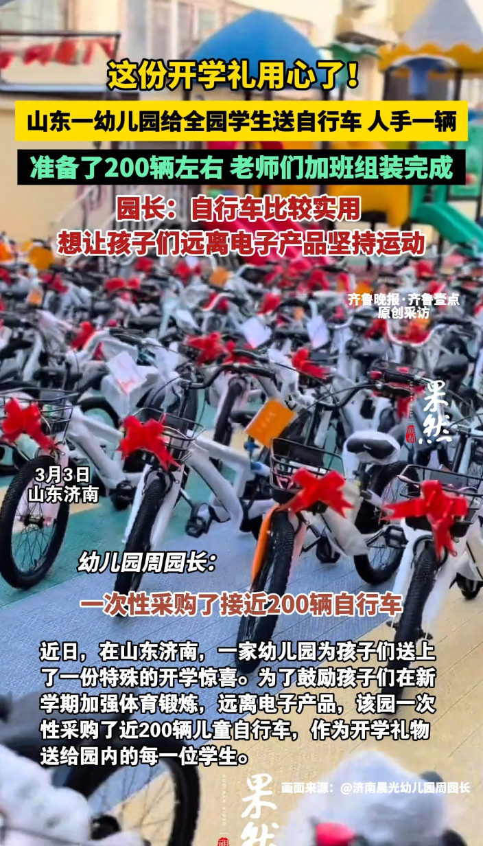 果然视频|引导拒绝电子产品!山东这所幼儿园用自行车当开学礼齐鲁晚报·齐鲁壹点客户端 10:17原创近日,山东济南一幼儿园为迎接开学采购了近200辆自行车,送给园内每一位孩子,新生老生人手一辆。该园园长表示,为了能让孩子们第一时间收到惊喜,老师们利用休息时间加班加点将自行车组装完成,饱含着老师们对孩子的爱与期待,希望通过这份特别的礼物,引导孩子远离电子产品、增加户外运动,养成健康的生活习惯,让强健的体魄成为学习与成长的坚实基础。(齐鲁晚报·齐鲁壹点 胡晓雪)