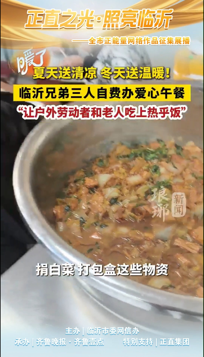 正直之光 照亮临沂|临沂兄弟三人自费办爱心午餐大众报业·齐鲁壹点 11:21临沂爱心午餐发起人胡乃江在柳青街道北岸枫景小区北门,每周一、三、五为环卫工、外卖员和老人提供免费热乎饭。从夏日“爱心冰箱”到冬日暖餐,一份热饭,温暖一座城!(齐鲁晚报·齐鲁壹点 通讯员 张金雪)