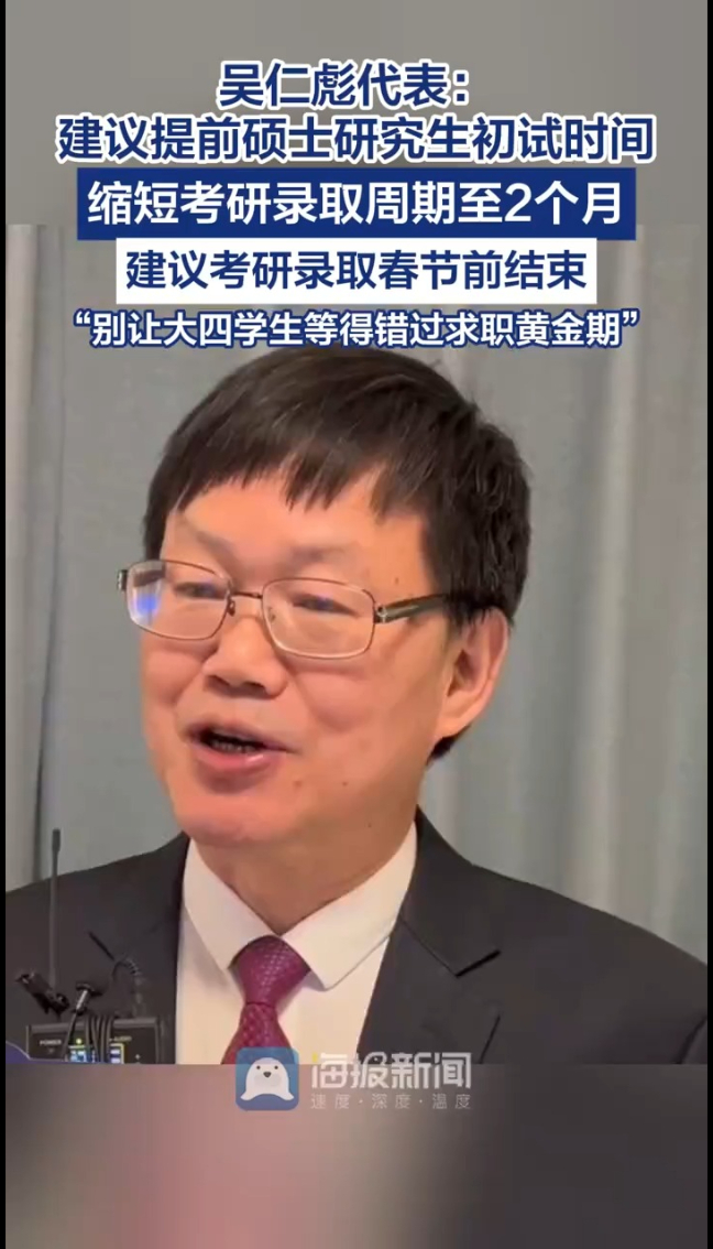 考研周期太长太“磨人”?全国人大代表吴仁彪建议,提前硕士研究生初试时间,把5个月考录间隔缩短至2个月,推动录取工作在春节前完成,同时加快阅卷与招生计划下达。