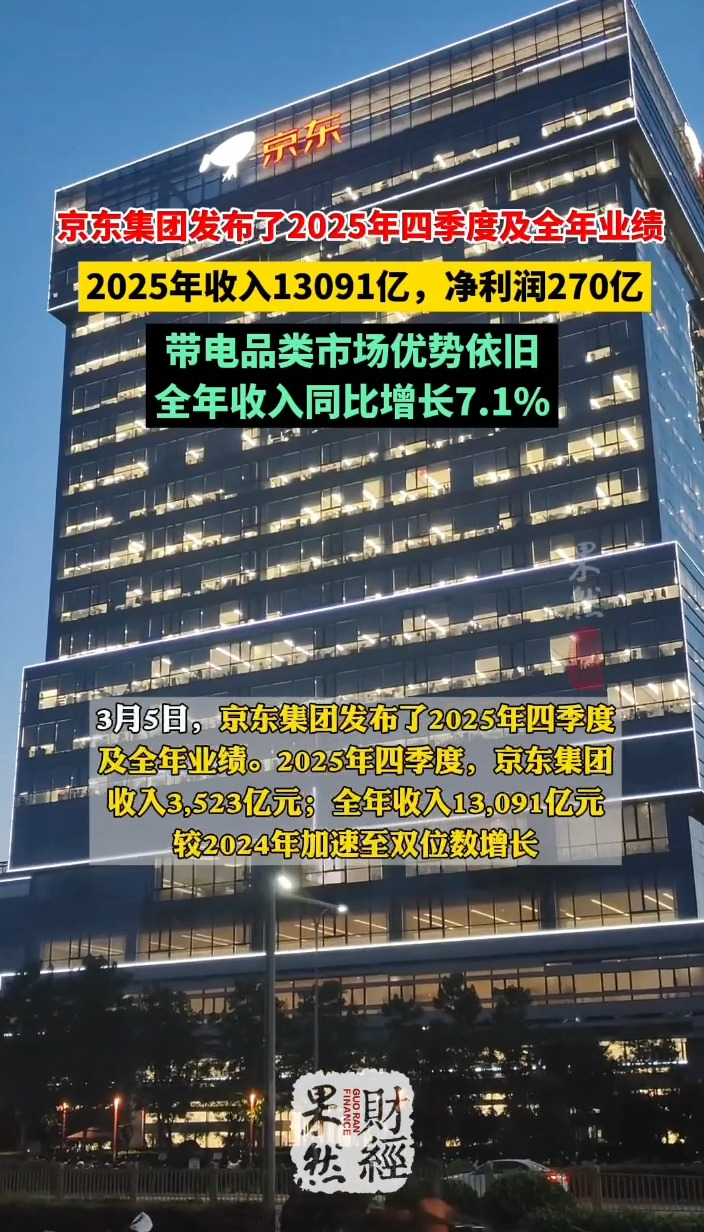 果然财经|京东集团2025年收入13091亿,净利润270亿 13:21 原创齐鲁晚报·齐鲁壹点客户端 微信扫码扫码下载客户端3月5日,京东集团发布了2025年四季度及全年业绩。2025年四季度,京东集团收入3,523亿元;全年收入13,091亿元,较2024年加速至双位数增长。