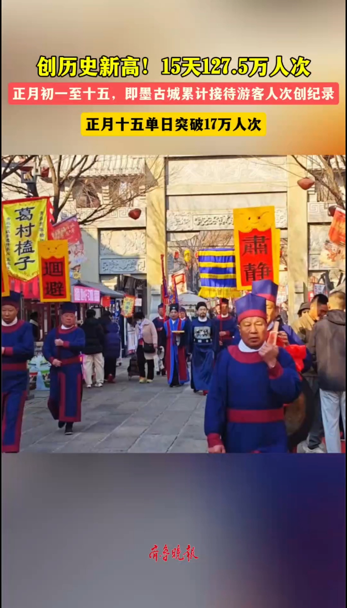 果然视频丨创新高!即墨古城正月十五天接待游客人次127.5万齐鲁晚报·齐鲁壹点客户端 16:07原创今年春节,即墨古城处处流淌着欢乐祥和的节庆气息,吸引着大批游客前来,沉浸式感受传统春节的独特魅力。正月初一至十五,即墨古城累计接待游客127.5万人次,尤其正月十五,单日突破17.5万人次,创历史新高!(齐鲁晚报·齐鲁壹点 宋祖锋)