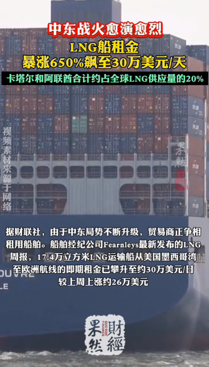果然财经|中东战火愈演愈烈 ,LNG船租金飙至30万美元/天