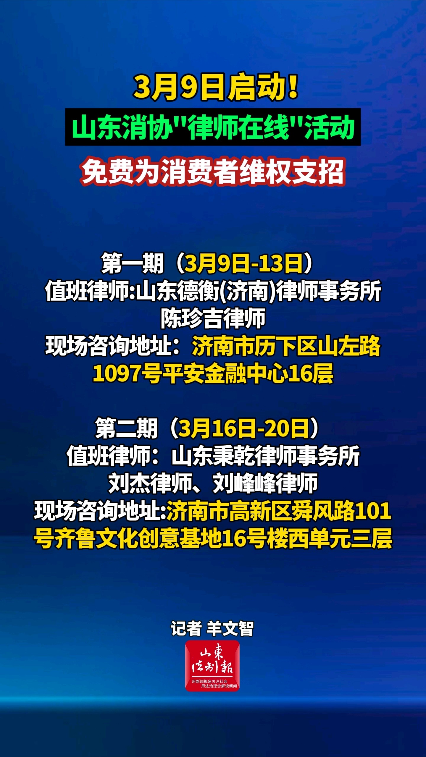 3月9日启动!山东消协“律师在线”活动,免费为消费者维权支招