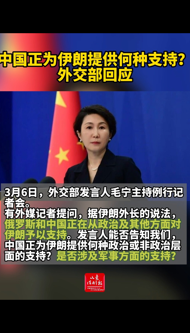 毛宁表示,中方反对美国和以色列违反国际法、对伊朗发动军事打击,支持伊朗捍卫主权、安全、领土完整和民族尊严,支持伊朗维护自身的正当合法权益。中方一贯主张通过政治外交途径解决问题,呼吁立即停止军事行动,防止战火蔓延外溢,避免局势进一步升级。