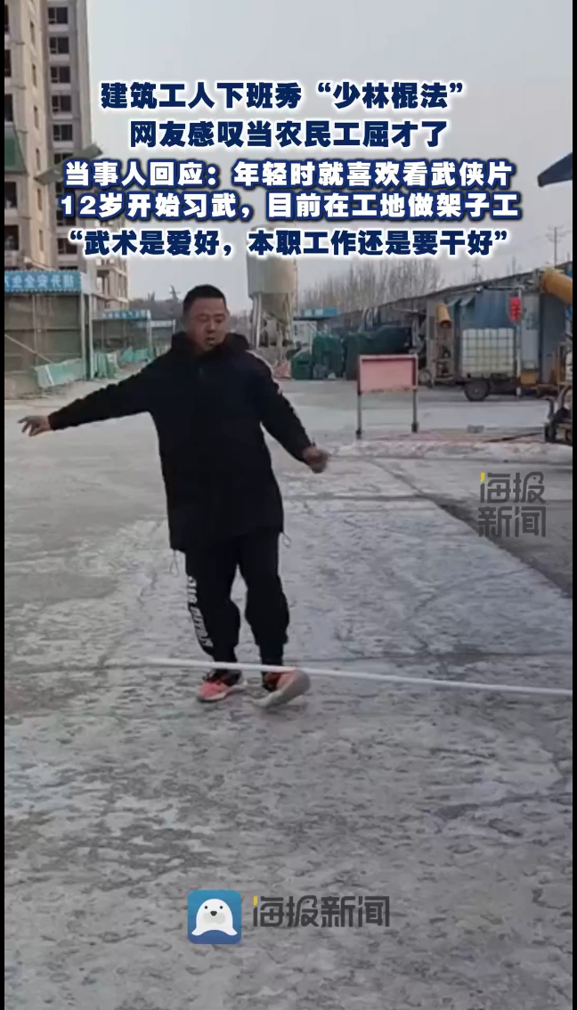 建筑工人下班秀“少林棍法”,网友感叹当农民工屈才了,当事人:“武术是爱好,本职工作还是要干好”海报新闻 | 昨天18:48 原创大众新闻·海报新闻 微信扫码扫码下载客户端(大众新闻·海报新闻记者 朱晓冲 报道)