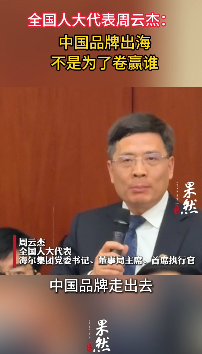 两会声音|全国人大代表周云杰:中国品牌出海,不是为了卷赢谁齐鲁晚报·齐鲁壹点客户端 昨天19:44原创3月6日下午,十四届全国人大四次会议山东省代表团举行开放团组活动。全国人大代表,海尔集团党委书记、董事局主席、首席执行官周云杰回答记者提问时说,中国品牌出海,不是为了卷赢谁,而是为了赢得世界对中国制造的尊重。相信未来会有更多山东企业屹立世界舞台。欢迎记者有时间来世界各地的海尔采访交流。 (齐鲁晚报·齐鲁壹点记者 杨璐 李文璇 刘志坤 鹿青松)