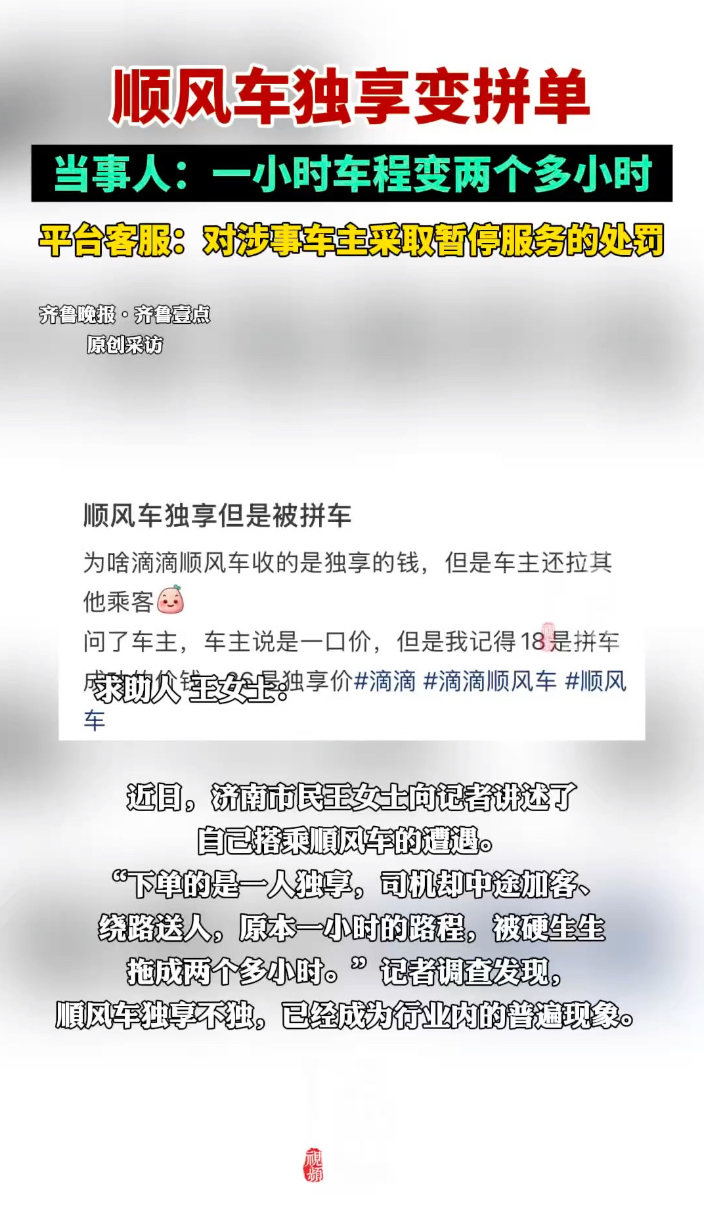 果然视频|花一人的钱,遭拼车的罪,顺风车独享咋不独呢齐鲁晚报·齐鲁壹点客户端 昨天20:30原创“下单的是一人独享,司机却中途加客、绕路送人,原本一小时的路程,被硬生生拖成两个多小时。”近日,济南市民王女士向记者讲述了自己搭乘顺风车的遭遇。记者调查发现,顺风车独享不独,已经成为行业内的普遍现象。(线索电话:0531-85193656;邮箱:405617016@qq.com)(齐鲁晚报·齐鲁壹点 岳致呈 杜嘉文)