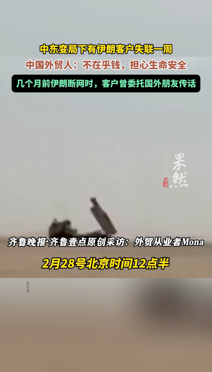 果然视频|伊朗客户失联一周,中国外贸人:不在乎钱担心他们安全齐鲁晚报·齐鲁壹点客户端 昨天21:57原创美国、以色列与伊朗发生军事冲突已经持续一周。炮火声中,无数中国外贸人的生意被迫按下了暂停键,但比起生意,人们更关切彼此的安全。在河北一家汽车配件企业工作的外贸从业者Mona,最近跟进的两个伊朗客户至今失联。“说实话,我现在也不是很在乎钱,主要还是担心他们的生命安全。”和伊朗客户打交道的经历,让Mona对他们印象不错。 (齐鲁晚报·齐鲁壹点记者 胡玲玲 路董萌)