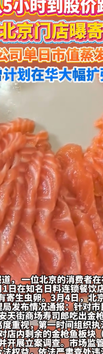 寿司郎北京门店金枪鱼吃出寄生虫卵,日本母公司股价大跌江苏经济报 11:36一位北京的消费者在社交平台投诉,她于3月1日在知名日料连锁餐饮店寿司郎进餐,发现鱼片上有寄生虫卵。随即,北京市门头沟区市场监督管理局介入调查。3月6日,寿司郎母公司、日本上市企业Food Life Companies股价一度下跌近14%。