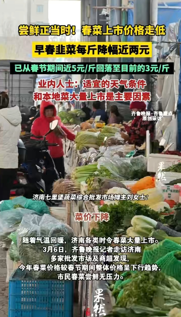 果然视频丨部分春菜每斤降价近两元,尝鲜正当时齐鲁晚报·齐鲁壹点客户端 11:54原创随着气温回暖,济南各类时令春菜大量上市。3月6日,记者走访济南多家批发市场及商超发现,今年春菜价格较春节期间整体价格呈下行趋势,市民春菜尝鲜无压力。对于春菜价格走低的原因,业内人士普遍认为,适宜的天气条件和本地菜大量上市是主要因素。(齐鲁晚报·齐鲁壹点 胡晓雪 杨涛)(齐鲁晚报·齐鲁壹点爆料电话:0531-85193656;邮箱:405617016@qq.com)