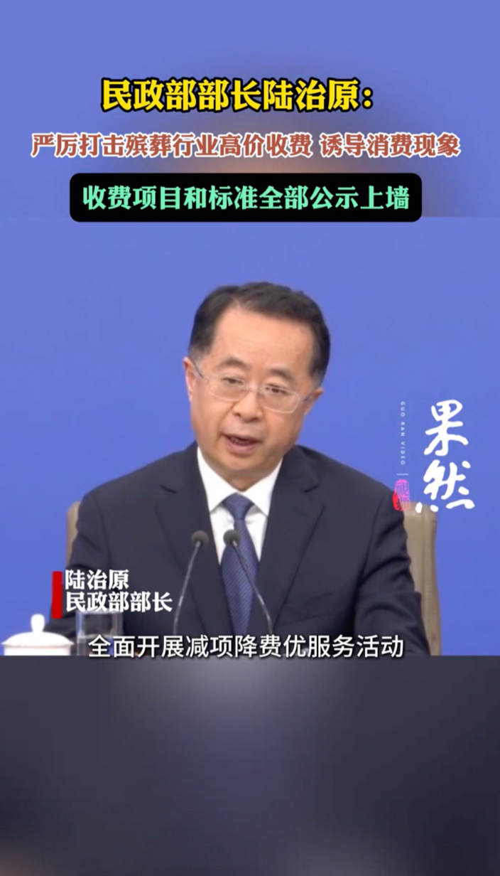 两会声音丨民政部部长陆治原:严厉打击殡葬行业高价收费、诱导消费现象齐鲁晚报·齐鲁壹点客户端 13:25原创3月7日,民政部部长陆治原在十四届全国人大四次会议民生主题记者会上表示,全面开展减项降费优服务活动,把不该有的殡葬项目减掉,严厉打击高价收费、诱导消费等现象,现在收费项目和标准全部要公示上墙。(齐鲁晚报·齐鲁壹点记者 鹿青松 刘志坤)