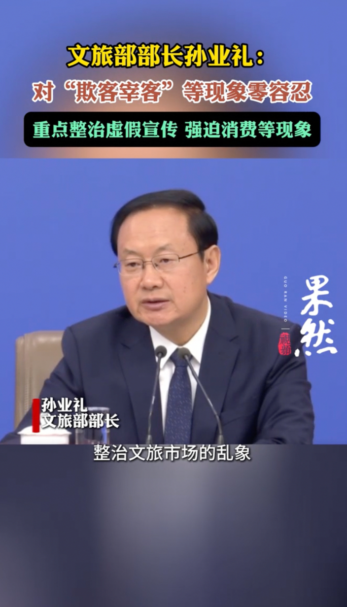 两会声音丨文旅部部长孙业礼:整治文旅市场乱象,重点整治虚假宣传、强迫消费等齐鲁晚报·齐鲁壹点客户端 13:49原创3月7日,文旅部部长孙业礼在十四届全国人大四次会议民生主题记者会上表示,加强市场管理,整治文旅市场的乱象,针对一些不良商家欺客宰客、强迫购物等违法违规行为,坚持零容忍、严监管,今年将联合相关部门持续开展专项整治行动,重点整治虚假宣传、非法招揽、强迫消费等,加大案件查处和公开通报的力度。(齐鲁晚报·齐鲁壹点记者 鹿青松 刘志坤)