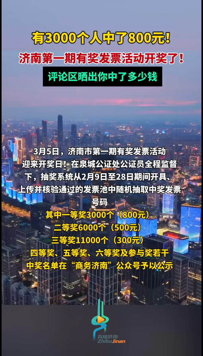 商务发布济南首期有奖发票开奖,有3000个人中了800元!齐鲁壹点 | 18:11 原创大众新闻·齐鲁壹点 微信扫码扫码下载客户端3月5日,济南市第一期有奖发票活动迎来开奖日。其中,一等奖(800元)3000个、二等奖(500元)6000个、三等奖(300元)11000个,以及四等奖、五等奖、六等奖和参与奖若干。