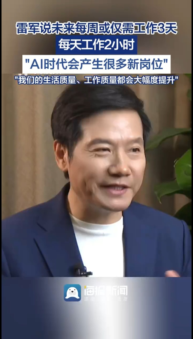 主播说|雷军说未来每周或仅需工作3天,每天工作2小时 03-07 原创大众新闻·海报新闻 微信扫码扫码下载客户端雷军说未来每周或只用工作3天,每天只需2小时!全国人大代表雷军接受采访时直言:AI时代很多规则将被重写,但也会催生大量新岗位。他表示,未来或许不用再996,每周工作3天每天2小时就能搞定工作,生活质量反而大幅提升!(海报新闻综合中国新闻周刊 编辑 左晓明 潘雯 张光 张坤)