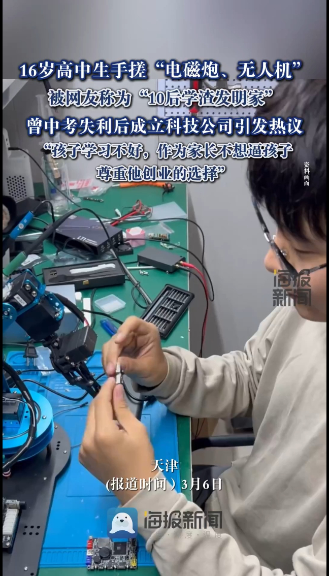 16岁高中生手搓“电磁炮、无人机” 曾中考失利后成立科技公司引发热议:孩子学习不好,尊重他创业的选择海报新闻 | 03-07 原创大众新闻·海报新闻 微信扫码扫码下载客户端(大众新闻·海报新闻记者 张旭 报道)