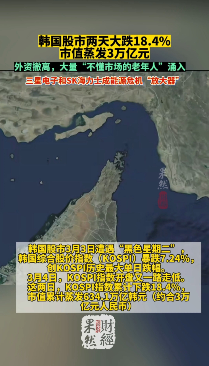 果然财经|太惨烈!韩国股市两天蒸发3万亿,全球领涨变暴跌齐鲁壹点 | 12:34 原创齐鲁晚报·齐鲁壹点客户端 微信扫码扫码下载客户端虽首尔与德黑兰相距6800公里,但伊朗紧张局势重创韩国股市。3月3日,韩国KOSPI指数重挫7.24%,创历史最大单日跌幅;次日再跌12.06%,触发2024年8月以来首次熔断,较近期高点跌近20%。两天内股市市值蒸发634.1万亿韩元(约3万亿元人民币),虽后续反弹,一周内总蒸发仍达504.9万亿韩元(约2.4万亿元人民币)。