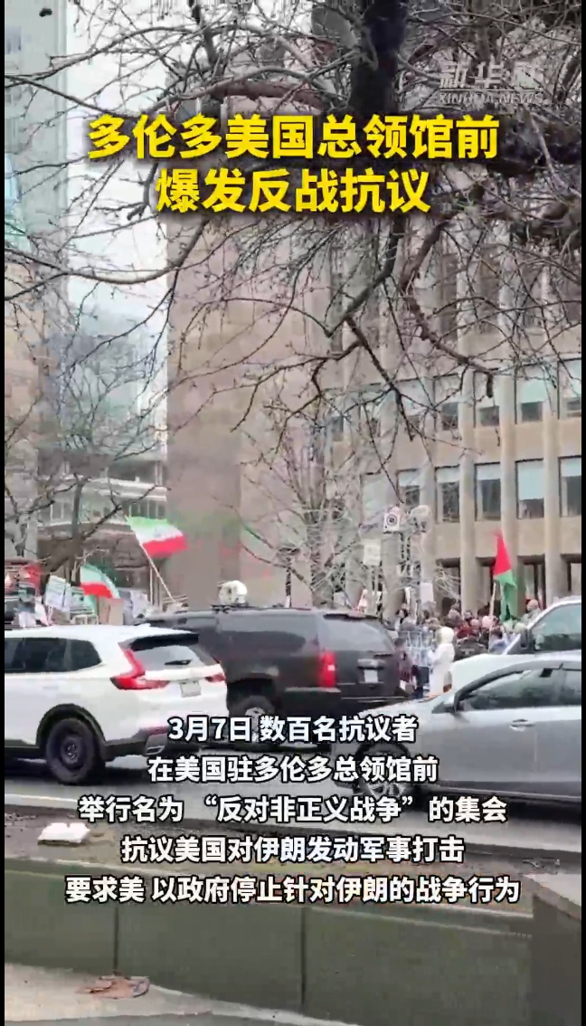 多伦多美国总领馆前爆发反战抗议新华社 15:203月7日,数百名抗议者在美国驻多伦多总领馆前举行名为“反对非正义战争”的集会,抗议美国对伊朗发动军事打击,要求美、以政府停止针对伊朗的战争行为。作者:林威、李海涛新华社音视频部制作