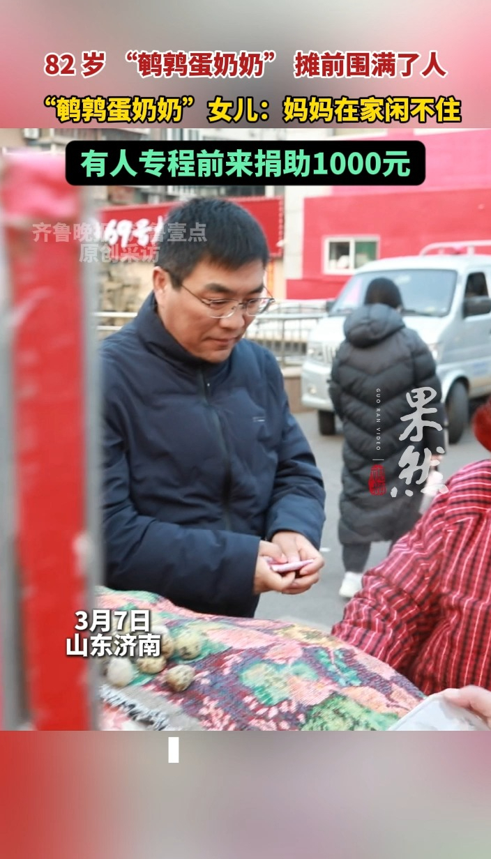 果然视频|82岁 “鹌鹑蛋奶奶” 摊前围满了人齐鲁晚报·齐鲁壹点客户端 03-08原创齐鲁晚报·齐鲁壹点 李苗 岳致呈 近日,济南 82 岁 “鹌鹑蛋奶奶” 宋爱玉因十年不涨价卖鹌鹑蛋为家人还债,引发关注。8日,宋爱玉女儿杨女士告诉齐鲁晚报·齐鲁壹点记者,“我劝过母亲别再摆摊,可她总想着为家里做点贡献,让她在家待着待不住。”(齐鲁晚报·齐鲁壹点爆料电话:0531-85193656;邮箱:405617016@qq.com)
