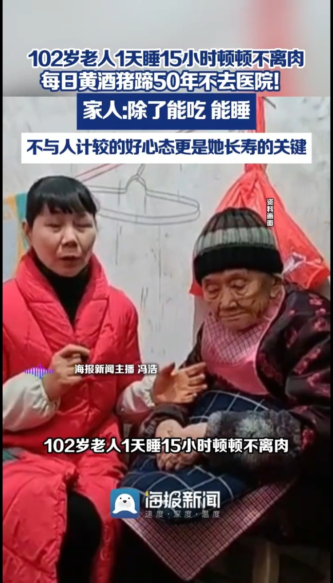 102岁老人1天睡15小时顿顿不离肉,每日黄酒猪蹄50年不去医院!浙江台州一位老人今年102岁,虽耳背、关节僵硬需辅助行走,但精神矍铄,除几年前感冒挂点滴外,已50余年未踏入医院。她的秘诀在于:每天“早睡晚起”加午睡,一天能睡15个小时;一日三餐不含糊,每顿必啃两三块猪脚,每天喝黄酒。家人称,除了能吃能睡,豁达、不与人计较的好心态更是她长寿的关键。