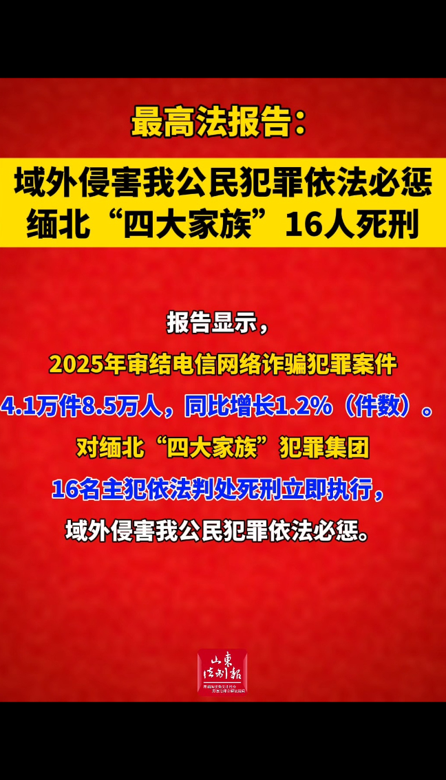 最高法报告:域外侵害我公民犯罪依法必惩 缅北“四大家族”16人死刑 昨天14:52 现场央视新闻客户端 微信扫码扫码下载客户端第十四届全国人民代表大会第四次会议于9日上午在北京人民大会堂举行第二次全体会议,最高人民法院院长张军作最高人民法院工作报告。报告显示,2025年审结电信网络诈骗犯罪案件4.1万件8.5万人,同比增长1.2%(件数)。对缅北“四大家族”犯罪集团16名主犯依法判处死刑立即执行,域外侵害我公民犯罪依法必惩。