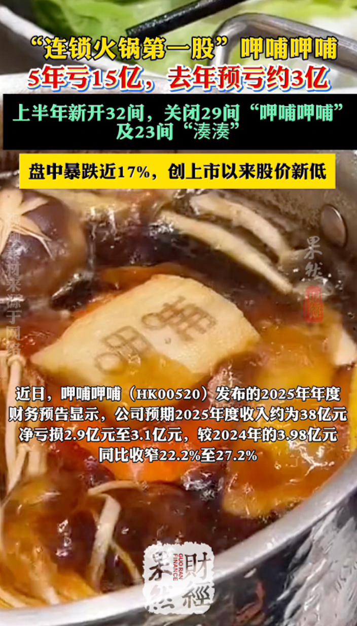 果然财经|“连锁火锅第一股”呷哺呷哺5年亏15亿,盘中暴跌 昨天16:41 原创齐鲁晚报·齐鲁壹点客户端 微信扫码扫码下载客户端近日,呷哺呷哺(HK00520)发布的2025年年度财务预告显示,公司预期2025年度收入约为38亿元;净亏损2.9亿元至3.1亿元,较2024年的3.98亿元同比收窄22.2%至27.2%。据每日经济新闻,3月9日,“连锁火锅第一股” 呷哺呷哺(00520.HK)股价开盘一路低开低走,盘中一度大跌近17%,跌破0.6港元/股,创下上市以来股价新低。