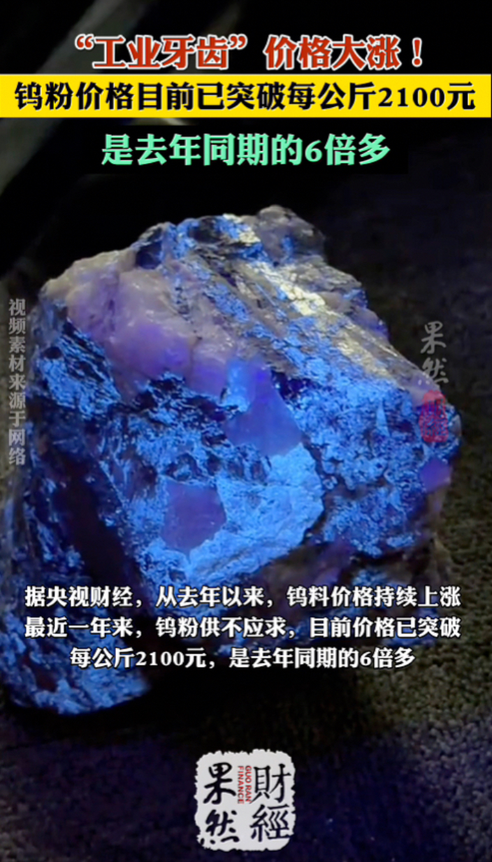 果然财经|“工业牙齿”价格大涨!钨粉价格突破每公斤2100元 昨天16:41 原创齐鲁晚报·齐鲁壹点客户端 微信扫码扫码下载客户端金属钨,被称为“工业牙齿”,是一种具有独特物理和化学性质的稀有金属,熔点高、硬度高、耐腐蚀,在工业领域有着广泛应用。据央视财经,从去年以来,钨料价格持续上涨。最近一年来,钨粉供不应求,目前价格已突破每公斤2100元,是去年同期的6倍多。