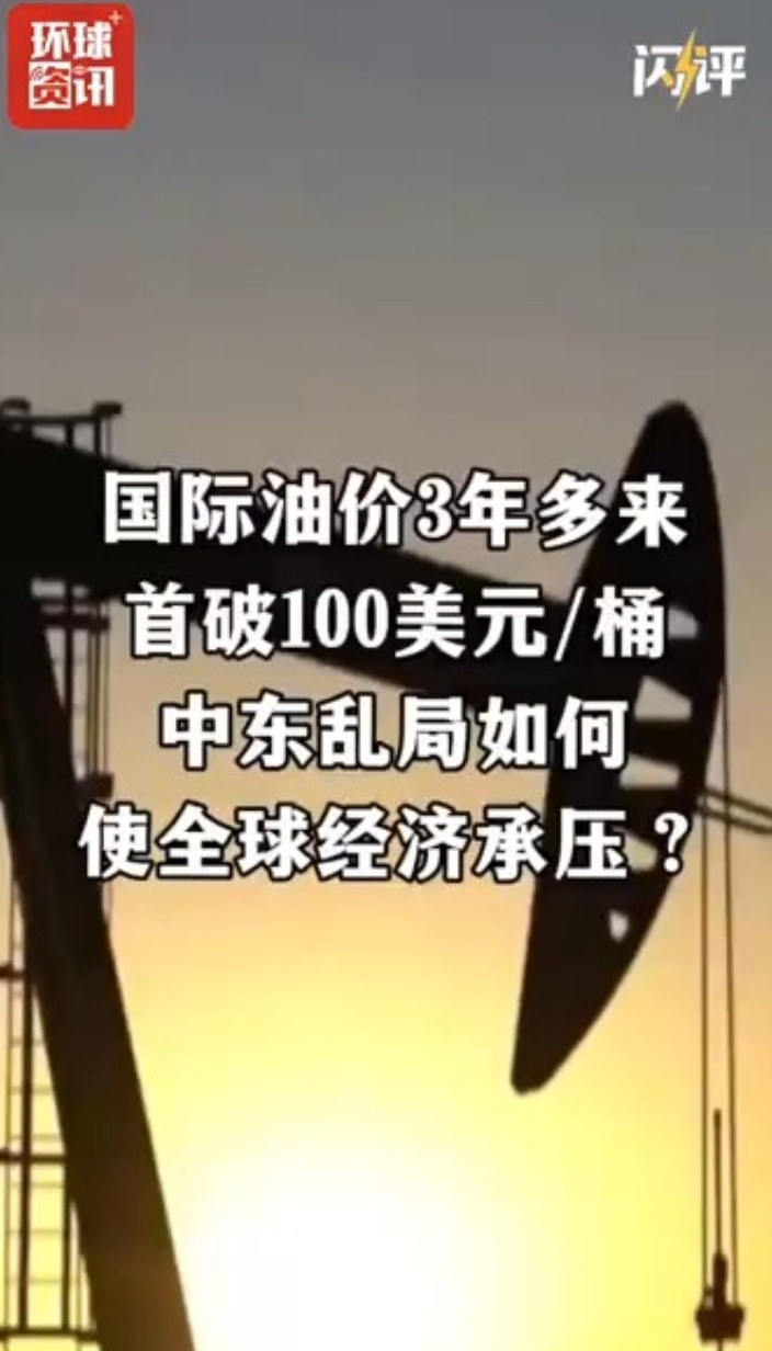 国际油价3年多来首破100美元/桶,中东乱局如何使全球经济承压央视新闻 昨天21:40当地时间3月8日,纽约、布伦特原油期货双双突破每桶100美元,甚至一度站上110美元大关,为2022年以来首次。为何油价反应如此剧烈?全球经济与金融市场还将受到怎样的影响?点击视频。 (央视新闻)