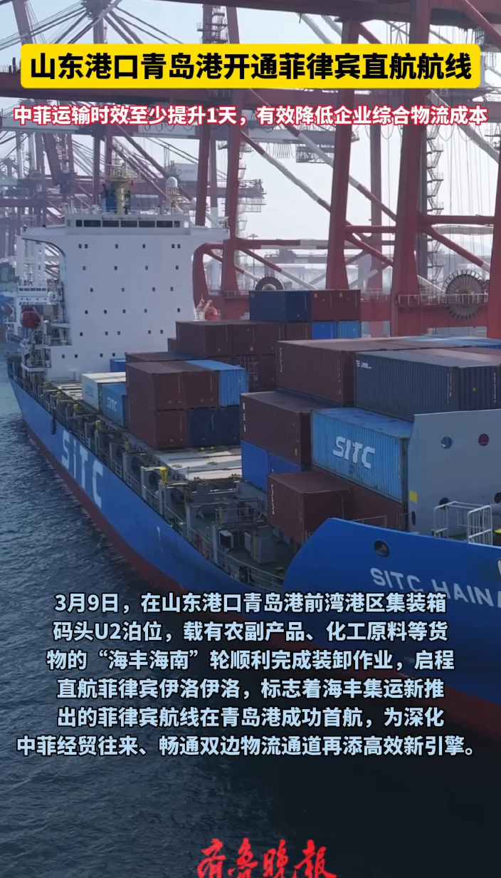 山东港口青岛港开通菲律宾直航航线,运输时效至少提升1天齐鲁晚报·齐鲁壹点客户端 09:58原创3月9日,在山东港口青岛港前湾港区集装箱码头U2泊位,载有农副产品、化工原料等货物的“海丰海南”轮顺利完成装卸作业,启程直航菲律宾伊洛伊洛,标志着海丰集运新推出的菲律宾航线在青岛港成功首航,为深化中菲经贸往来、畅通双边物流通道再添高效新引擎。 (齐鲁晚报·齐鲁壹点记者 赵波)
