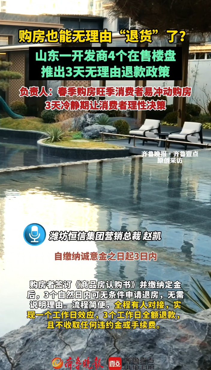 果然视频|购房可反悔!山东一房企推出“3天无理由退房”政策齐鲁晚报·齐鲁壹点客户端 11:00原创近日,山东潍坊本土龙头房企恒信集团宣布,旗下高新区名著系4个新房项目推出“3天无理由退房”政策,成为今年潍坊首个明确推出该服务的房企,旨在打消消费者购房顾虑,激活春季购房市场。 齐鲁晚报·齐鲁壹点 胡晓雪 马凤丽