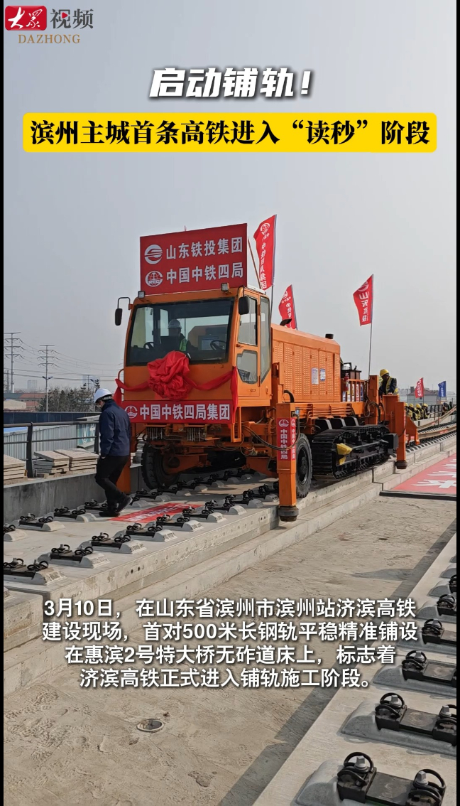 启动铺轨!滨州主城首条高铁进入“读秒”阶段大众新闻 | 15:11 原创大众新闻 微信扫码扫码下载客户端3月10日,在滨州市滨州站济滨高铁建设现场,首对500米长钢轨平稳精准铺设在惠滨2号特大桥无砟道床上,标志着济滨高铁正式进入铺轨施工阶段。(大众新闻记者 范薇 通讯员 靳江楠 郭泽 梁本良)