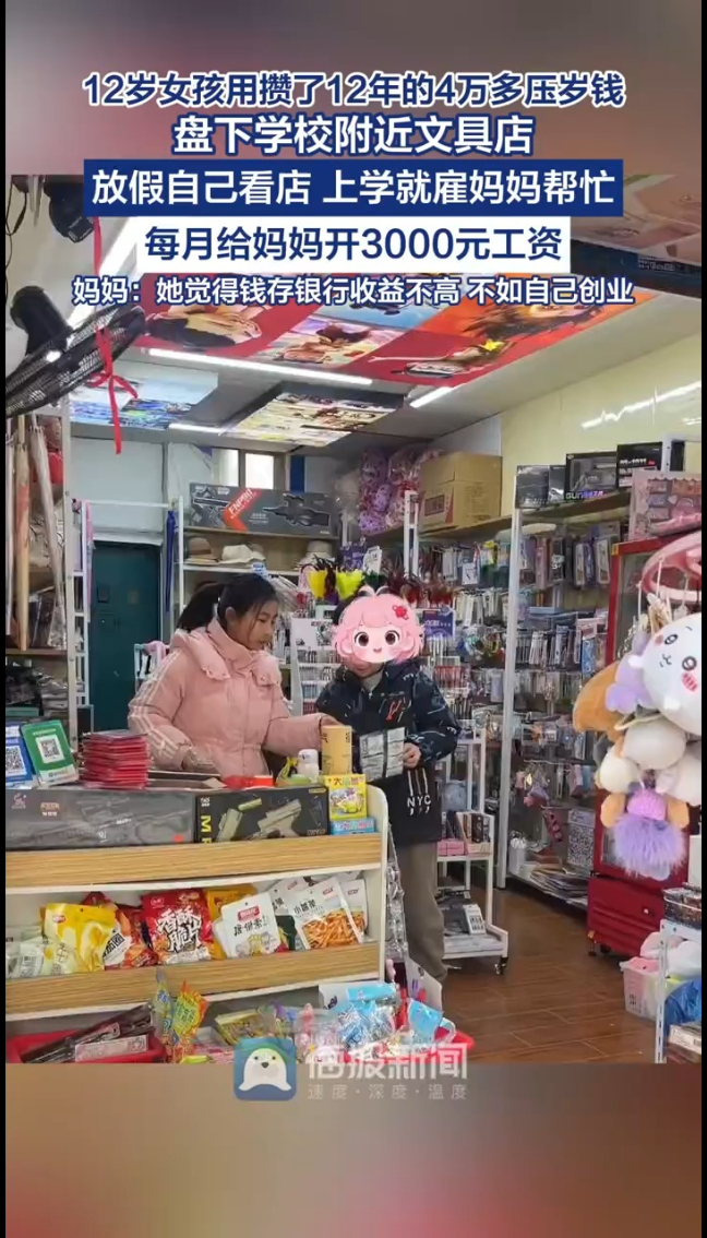 江西一位12岁女孩,用攒了12年的4万多元压岁钱和零花钱,盘下学校附近一家文具店。还以3000元/月雇妈妈帮忙看店。妈妈说:她觉得钱存银行收益不高,不如自己创业。女孩规划很清晰,放假自己看店,上学就雇妈妈帮忙,每月给妈妈开3000元工资。