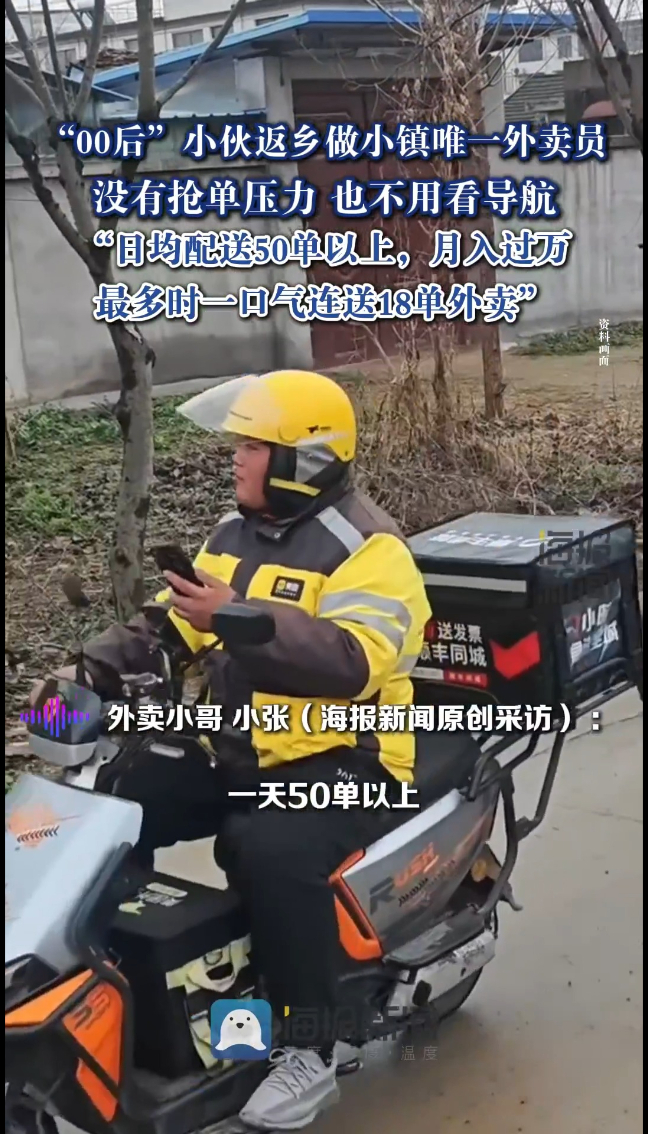 “00后”小伙返乡做小镇唯一外卖员:没有抢单压力,也不用看导航