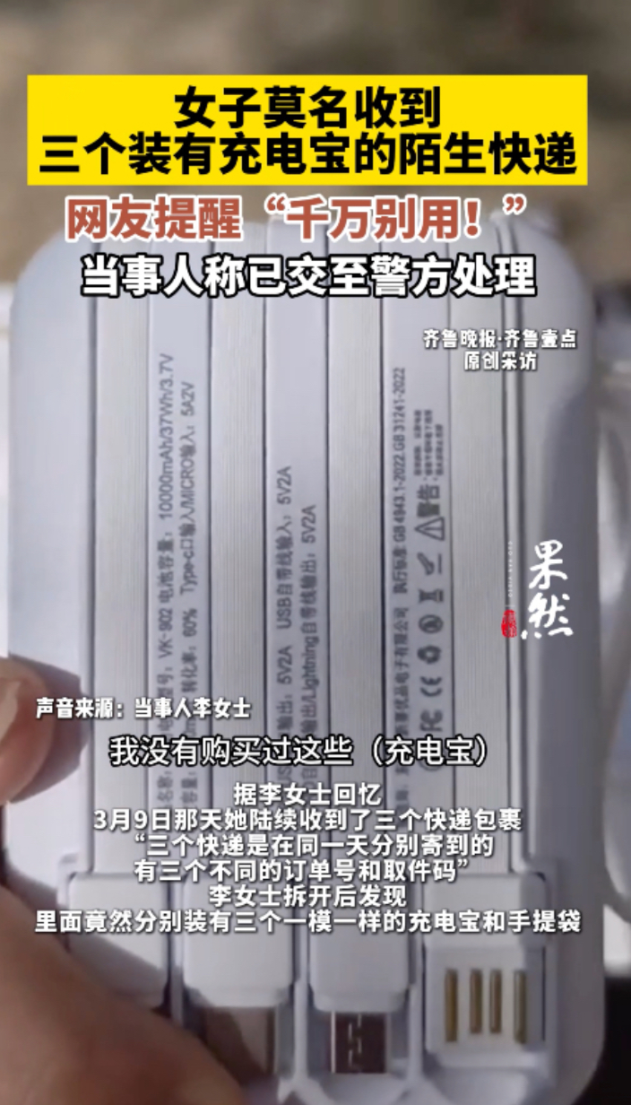 果然视频|女子莫名收到三个装有充电宝的陌生快递,网友提醒“千万别用!”齐鲁壹点 | 03-11 原创齐鲁晚报·齐鲁壹点客户端 微信扫码扫码下载客户端3月11日,网友李女士向齐鲁晚报·齐鲁壹点记者反映,近日她莫名收到了三个装有充电宝的陌生快递,不禁让她心存疑虑。 (齐鲁晚报·齐鲁壹点记者 周小涵 李家澍)