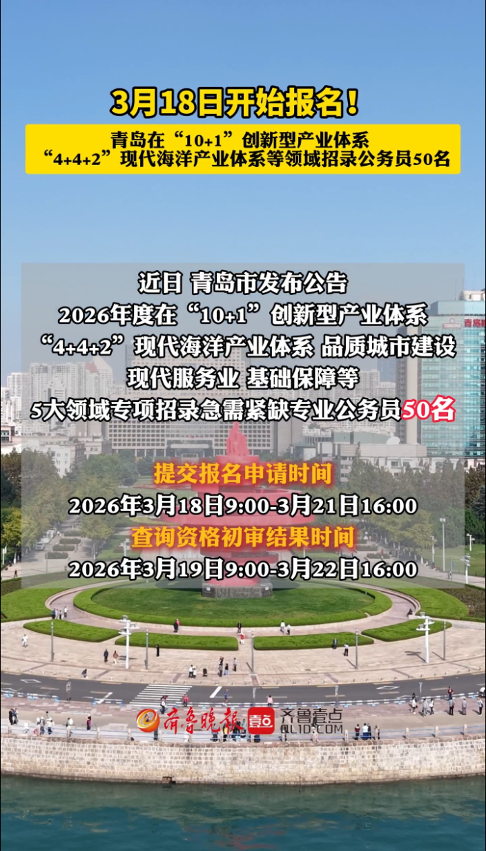 果然视频丨3月18日开始报名!青岛专项招录公务员50名齐鲁晚报·齐鲁壹点客户端 03-12原创近日,青岛市发布招聘公告。2026年度在“10+1”创新型产业体系、“4+4+2”现代海洋产业体系、品质城市建设、现代服务业、基础保障等5大领域专项招录急需紧缺专业公务员50名。提交报名申请时为2026年3月18日9:00-3月21日16:00,笔试时间为2026年4月中旬。 (齐鲁晚报·齐鲁壹点 曹婧雯)