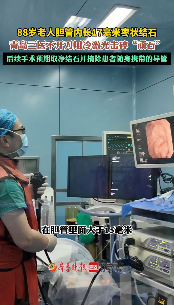 果然视频丨八旬患者长17毫米结石!青岛三医冷激光击碎“顽石”齐鲁晚报·齐鲁壹点客户端 03-12原创近日,一位88岁高龄的胆管结石患者来到青岛市第三人民医院肝胆外科寻求帮助。老人有既往胆管手术史,体内还“藏着”一枚直径达17mm、堪比成年人大拇指粗细的结石。医院肝胆外科团队采用微创技术,用冷激光击碎结石,为老人放置胆管支架,为后续彻底取石、摘除导管奠定基础。 (齐鲁晚报·齐鲁壹点 曹婧雯)