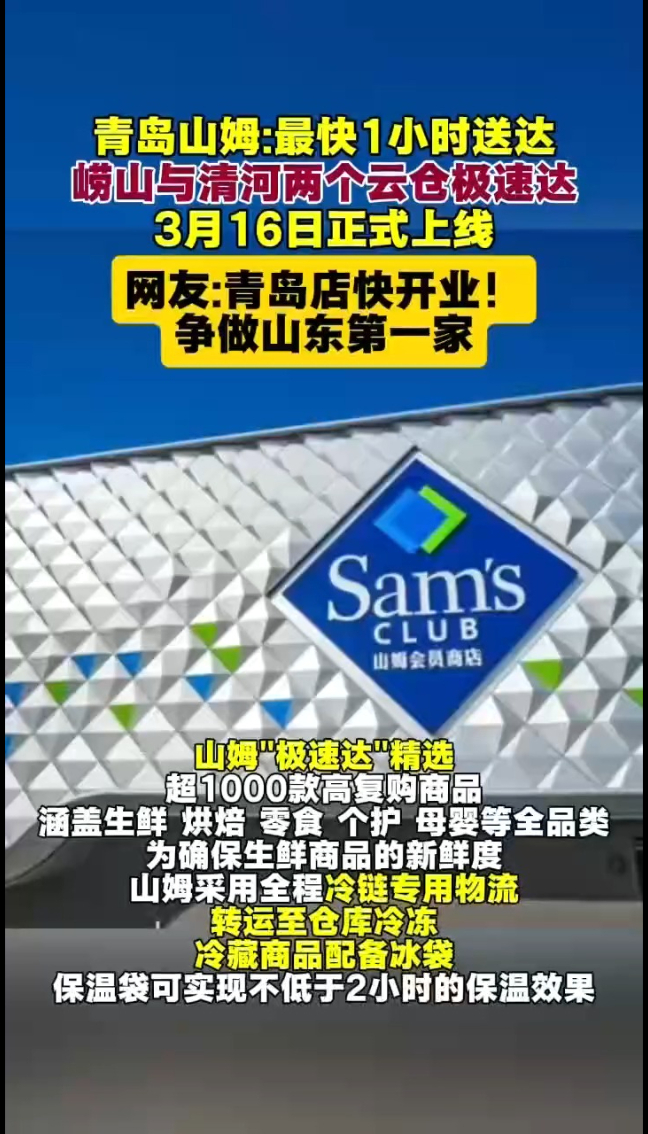 最快1小时送达!青岛山姆崂山与清河两个云仓"极速达"3月16日正式上线。