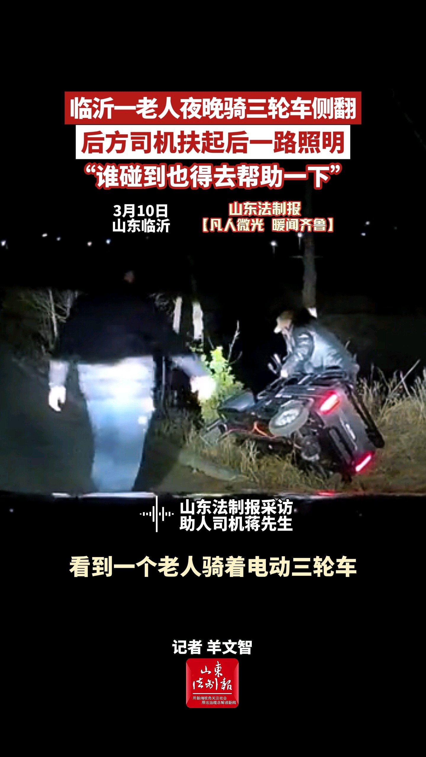 临沂一老人夜晚骑三轮车侧翻,后方司机停车扶起后一路照明,“谁碰到也得去帮助一下”山东法制报 | 03-12 独家山东法制报 微信扫码扫码下载客户端3月10日晚,临沂莒南县一处乡村道路上,一位老人骑三轮车侧翻。正驾车从老家返回城里的车主蒋先生看到后,立即下车将老人和车扶起,随后开车为老人照亮回家的路。他表示:“谁碰到也得去帮助一下。”(大众新闻·山东法制报记者 羊文智)