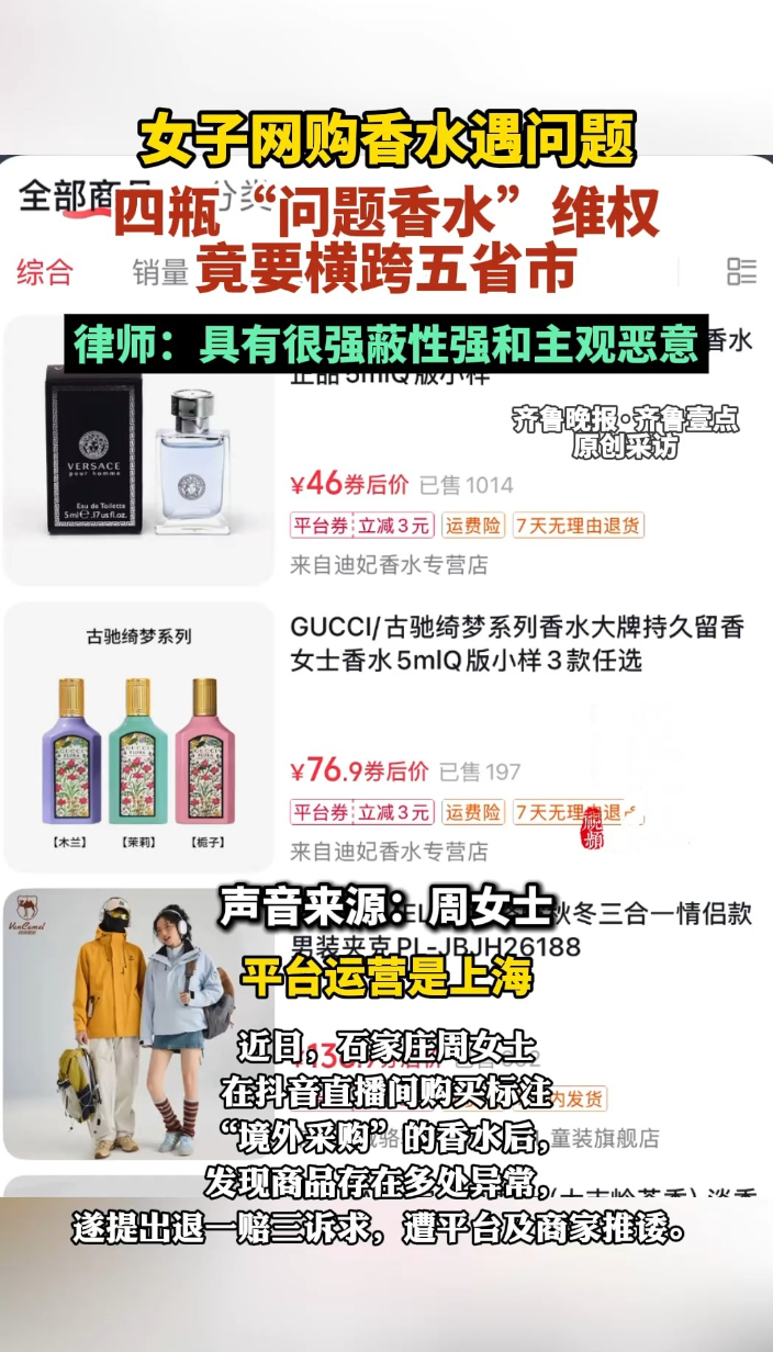 果然视频|网购的四瓶“问题香水”,维权要横跨五省市齐鲁晚报·齐鲁壹点客户端 03-12原创齐鲁晚报·齐鲁壹点 徐宁 陈晨 杨涛 近日,石家庄周女士在抖音直播间购买标注“境外采购”的香水后,发现商品存在多处异常,遂提出退一赔三诉求,遭平台及商家推诿。经查,该直播间账号认证主体、发货商家分别位于杭州、广州,均因无法取得联系被列入经营异常名录;平台所在地上海、售后地址安徽、直播达人认证地址湖南均以无管辖权为由未受理投诉,维权涉及五省市。