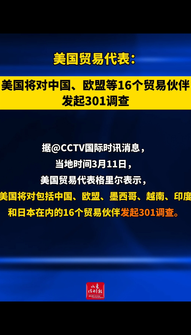 据@CCTV国际时讯消息,当地时间3月11日,美国贸易代表格里尔表示,美国将对包括中国、欧盟、墨西哥、越南、印度和日本在内的16个贸易伙伴发起301调查。