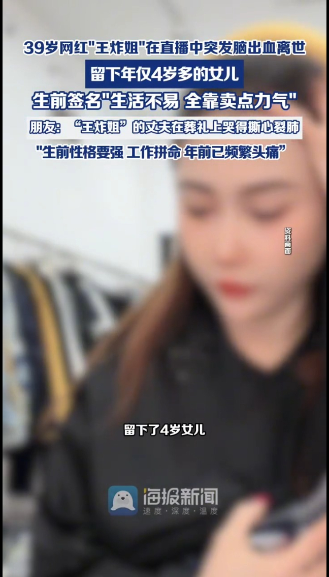 朋友悲痛地告诉记者,“王炸姐”性格要强,工作非常拼命,每天操心多、睡眠少。其实年前她就频繁喊头疼,但根本没当回事,依旧每天高强度直播。她的生前签名"生活不易,全靠卖点力气",没想到,竟成了她人生的真实写照。