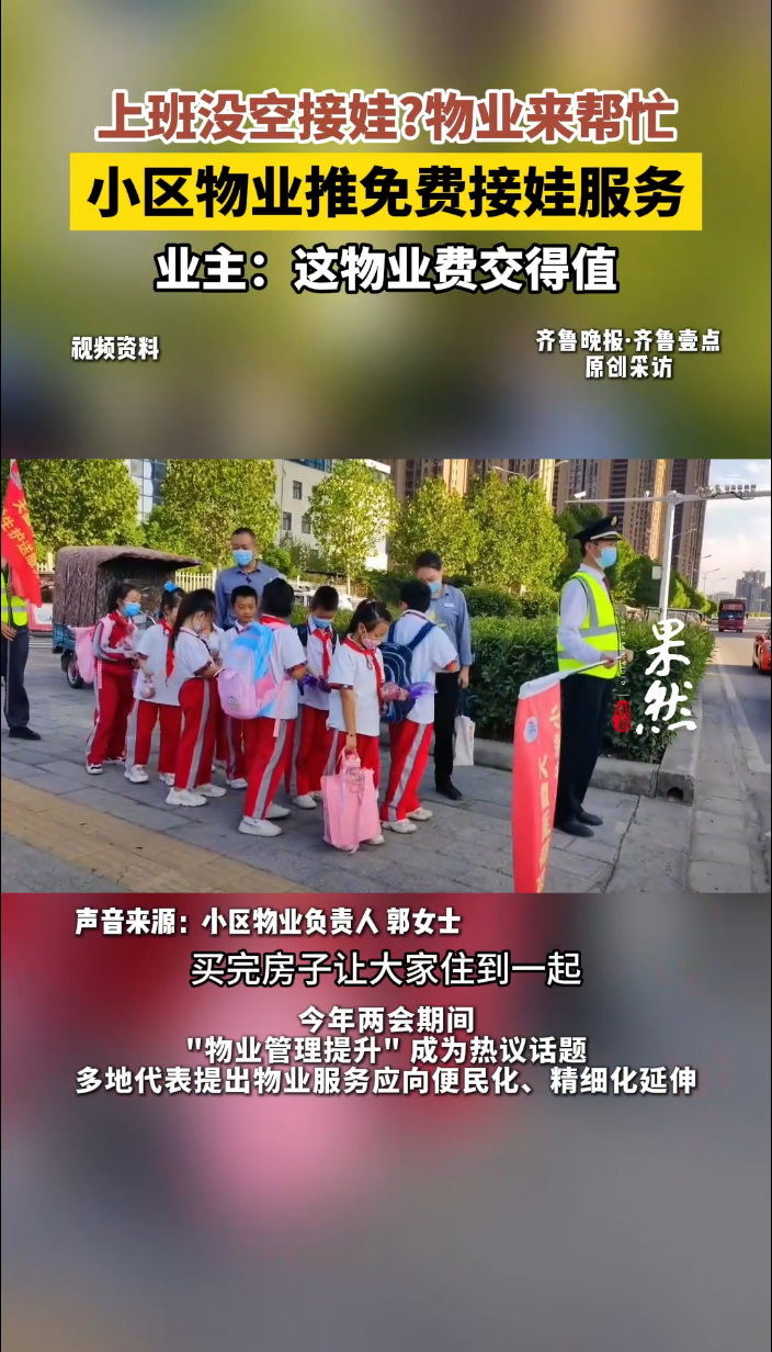 果然视频|上班没空接娃?物业帮忙!有物业公司推出免费接娃服务齐鲁晚报·齐鲁壹点客户端 03-12原创近日,有网友在短视频平台发布了河南漯河一小区物业推出的免费接孩子的视频,视频引发网友热议。从现场视频中能看到,放学时段的学校门口,物业工作人员手持醒目的旗子站在固定点位,一群孩子有序等候在旁,工作人员依照登记名单挨个点名确认,清点人数后再统一护送孩子们返回小区,整个流程规范又有序。