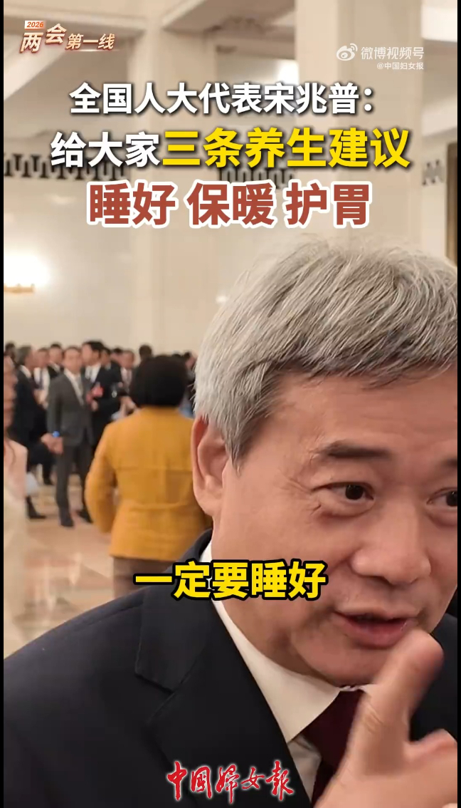 全国人大代表宋兆普给出三条养生建议中国妇女报 03-12全国人大代表、河南省汝州金庚康复医院院长宋兆普给大家三条养生建议:第一要睡好,女性睡好变更美;第二要保暖,切不可受凉喝冷饮,女性喜温不喜寒;第三要护胃,脾胃健则身体健。(中国妇女报全媒体记者 宿琳)