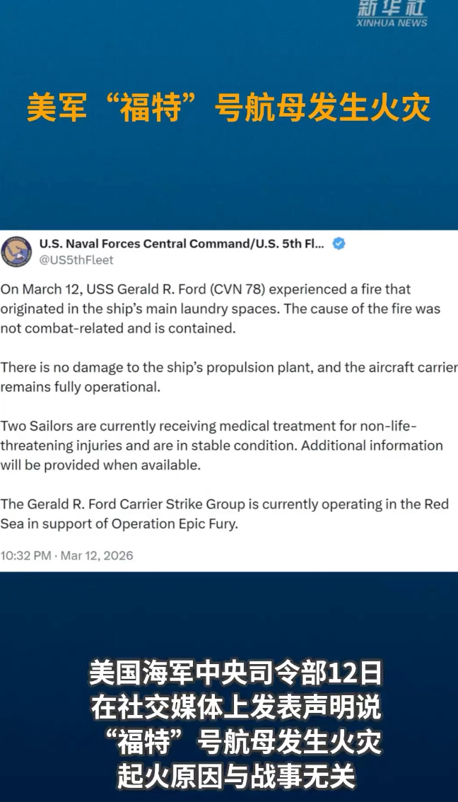 美国海军中央司令部12日在社交媒体上发表声明说,“福特”号航母发生火灾,起火原因与战事无关。