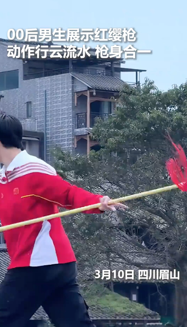 00后男生展示红缨枪,动作行云流水、枪身合一。网友:太帅了!