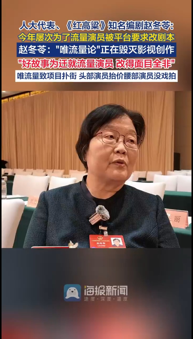 知名编剧赵冬苓直言现在“很苦恼”,以往她的剧本都是“一稿过”,今年却屡次被平台要求改剧本,改成流量演员能(这个“能”字重读)演的角色。这位写过《红高粱》《警察荣誉》的全国人大代表称,“唯流量论”正在毁灭影视创作。