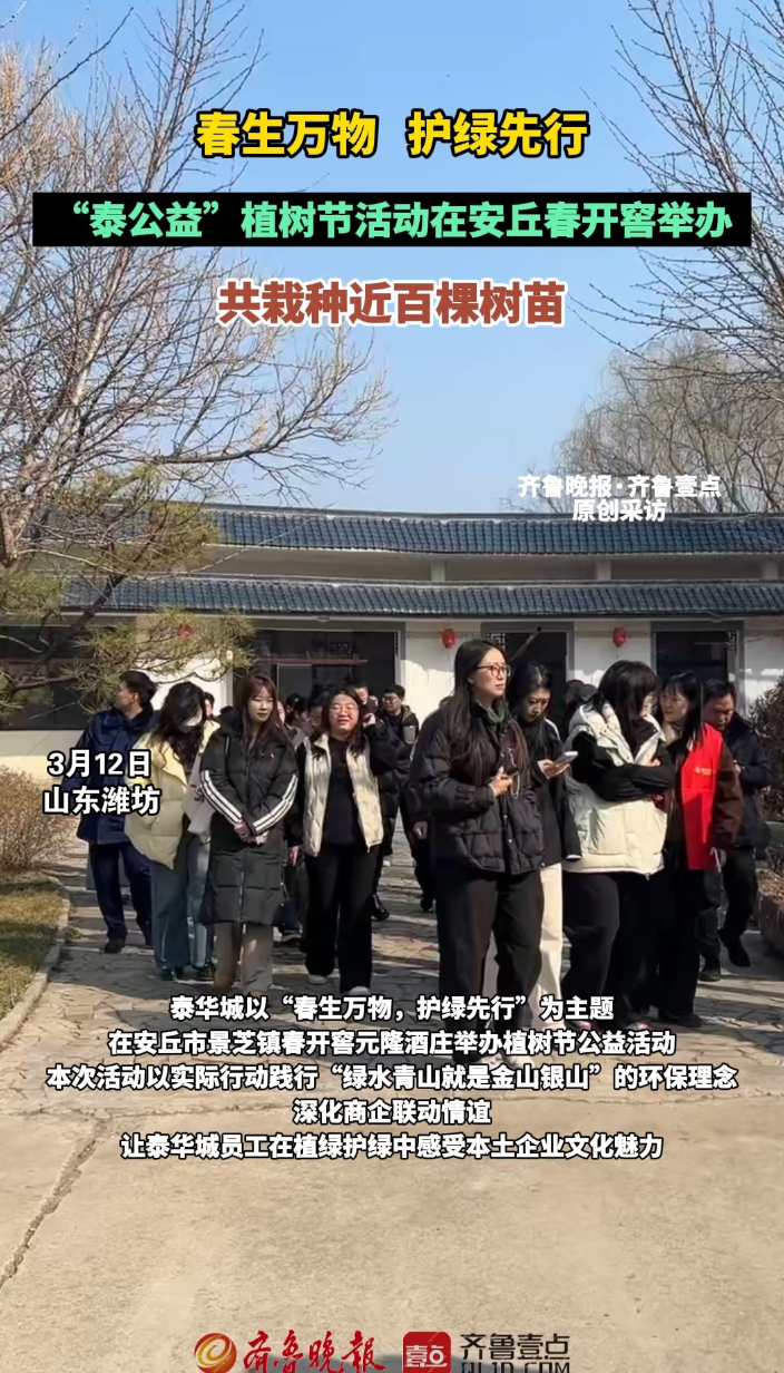 果然视频|“泰公益”植树节活动在安丘春开窖举办齐鲁晚报·齐鲁壹点客户端 昨天10:21原创3月12日,泰华城以“春生万物,护绿先行”为主题,在安丘市景芝镇春开窖元隆酒庄举办植树节公益活动。本次活动以实际行动践行“绿水青山就是金山银山”的环保理念,深化商企联动情谊,让员工在植绿护绿中感受本土企业文化魅力,寓意着企业与事业像树木一样“扎根沃土,基业长青”。植树劳作结束后,大家一起参观春开窖酒业的酿酒车间与窖池。 齐鲁晚报·齐鲁壹点 张晓慧 潘英杰