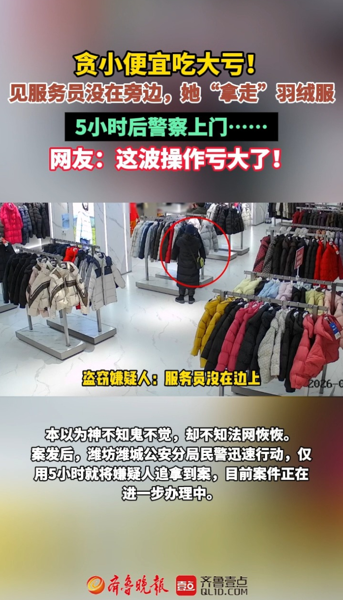果然视频|女子临时起意顺走羽绒服,潍城公安5小时破案齐鲁晚报·齐鲁壹点客户端 昨天10:21原创近日,一女子在潍坊潍城购物时,趁服务员暂时离开,临时起意将店内一件羽绒服顺走。接到报警后,潍城公安民警迅速行动,仅用5小时就将嫌疑人抓获归案,并追回被盗衣物。目前,案件正在进一步办理中。 齐鲁晚报·齐鲁壹点 王佳潼 通讯员 郭鹏