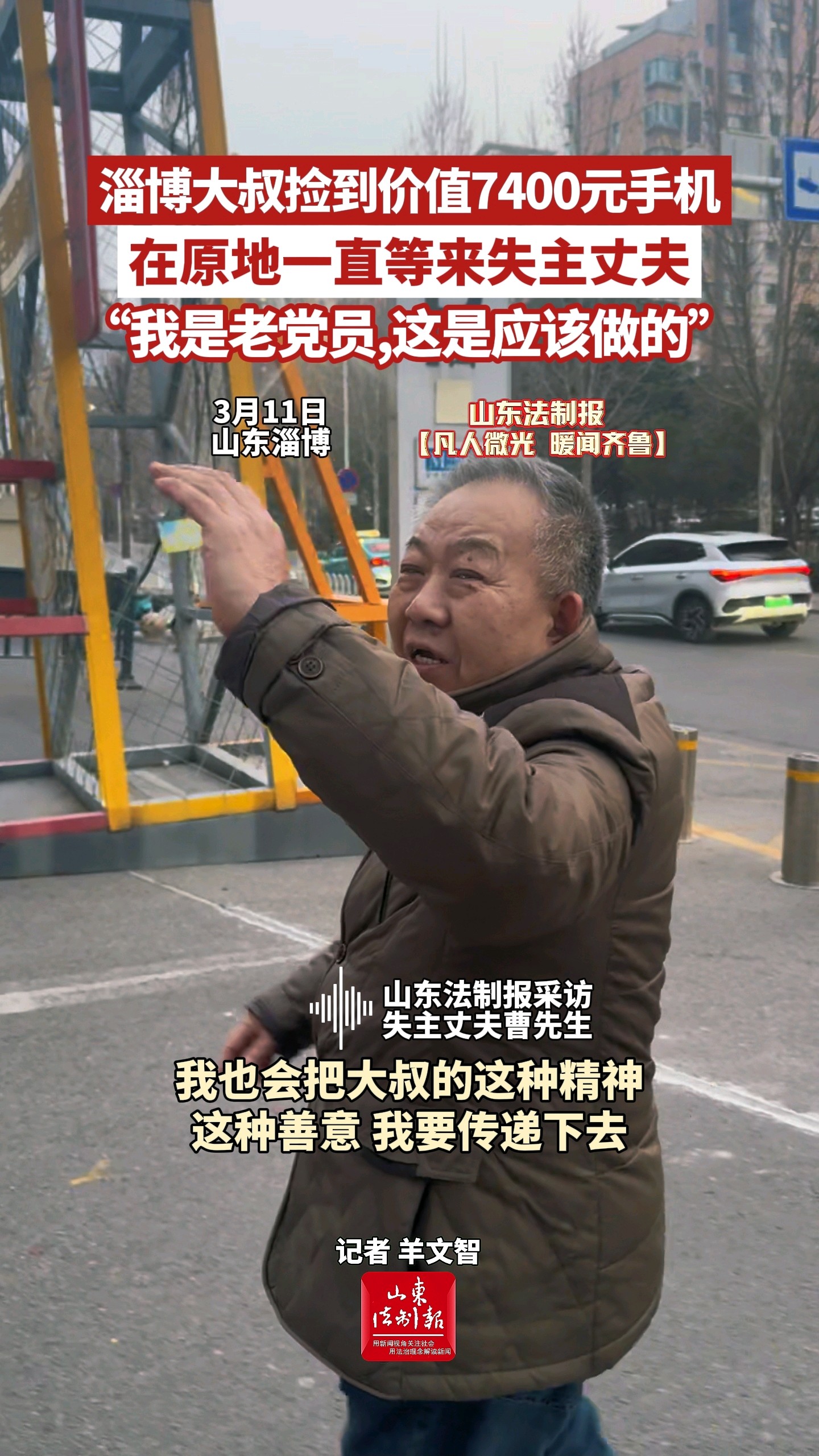 淄博大叔捡到价值7400元手机,在原地一直等来失主丈夫,“我是老党员,这是应该做的” 昨天14:52 原创山东法制报 微信扫码扫码下载客户端3月11日下午,淄博一位女士价值7400多元的手机不慎遗失。其丈夫曹先生通过电话联系到捡到手机的老人,此时老人已在原地等候一个小时。老人告知地址后,曹先生赶到现场将手机认领。 当曹先生想给老人转钱致谢时,被老人果断拒绝。老人说:“我是名老党员,这是我应该做的。”(大众新闻·山东法制报记者 羊文智)